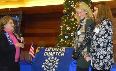 Regent Suzanne Jarman welcomes new member Maggie Cox as her mother Ann Cox looks on.